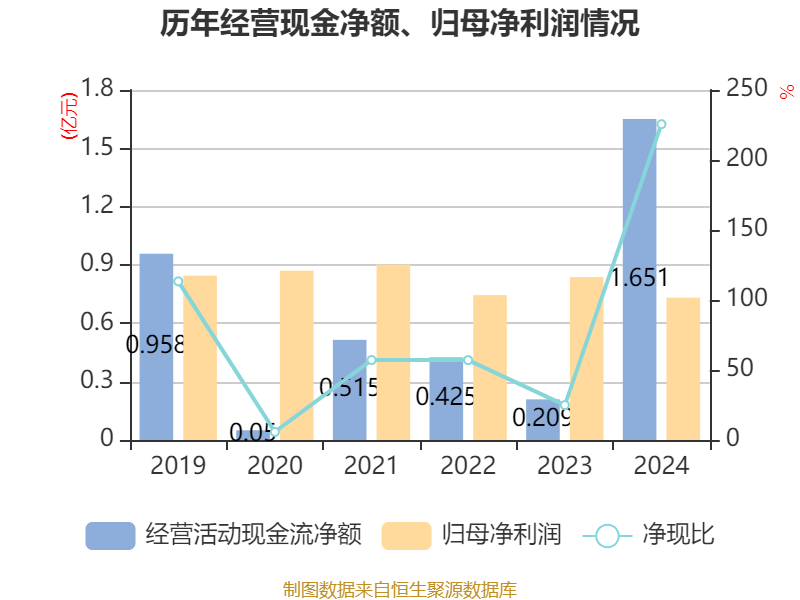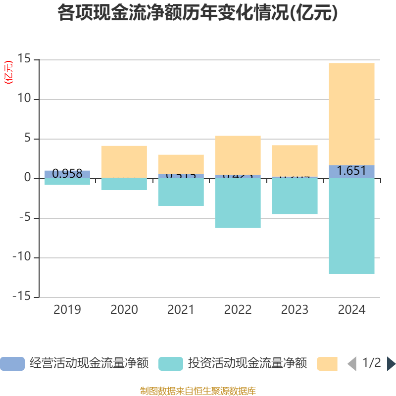 截至2024年,公司经营活动现金流净额为1.65亿元,同比增长690.48%;筹资活动现金流净额12.89亿元,同比增加8.94亿元;投资活动现金流净额-12.1亿元,上年同期为-4.52亿元。