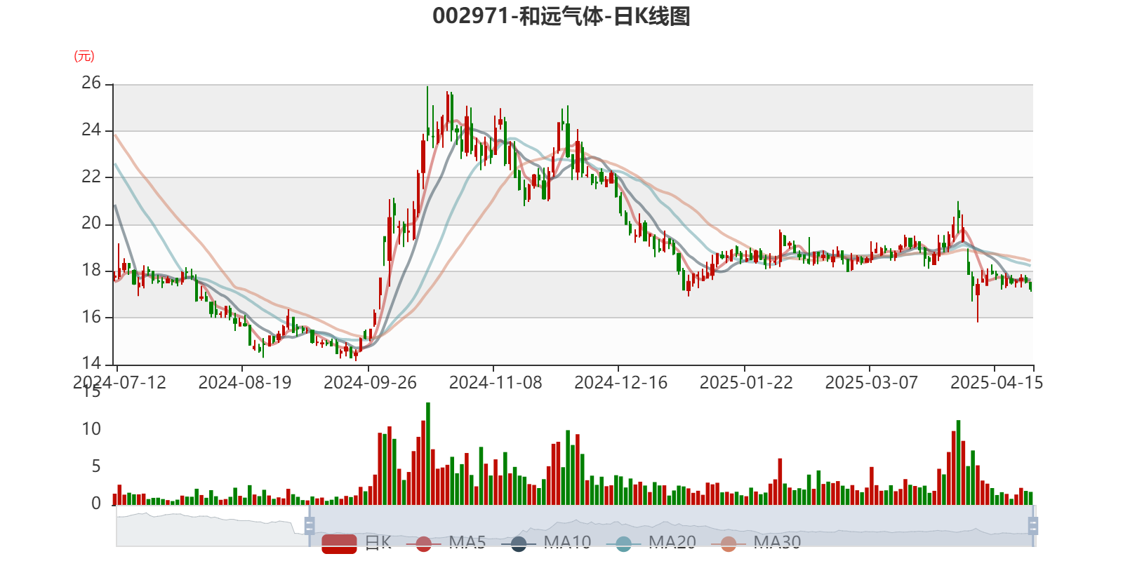 股东名称持流通股数(万股)占总股本比例(%)变动比例(百分点)湖北交投资本投资有限公司1975.599.352577新进长江成长资本投资有限公司1250.475.919805-0.092杨涛1090.375.161869-0.080钟格1024.864.851753新进前海人寿保险股份有限公司-分红保险产品875.734.1457390.032杨勇发684.463.240276-0.050乾图唐玄甲私募证券投资基金585.182.770264-0.043长阳鸿朗咨询管理中心(有限合伙)499.622.365244-0.996湖北佰仕德创业服务有限公司421.691.996329-0.223杨峰391.311.852509-0.029值得注意的是,中登公司数据显示,截至2025年4月18日,和远气体18.38%股份处于质押状态。年报显示,第一大股东杨涛质押2242.98万股公司股份,占其全部持股的51.43%;第三大股东杨峰质押970.01万股公司股份,占其全部持股的61.97%;第七大股东杨勇发质押440万股公司股份,占其全部持股的64.28%。