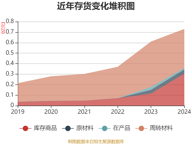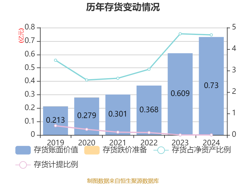 从存货变动来看,截至2024年末,公司存货账面价值为7299.83万元,占净资产的4.66%,较上年末增加1206.71万元。公司本期没有计提存货跌价准备。