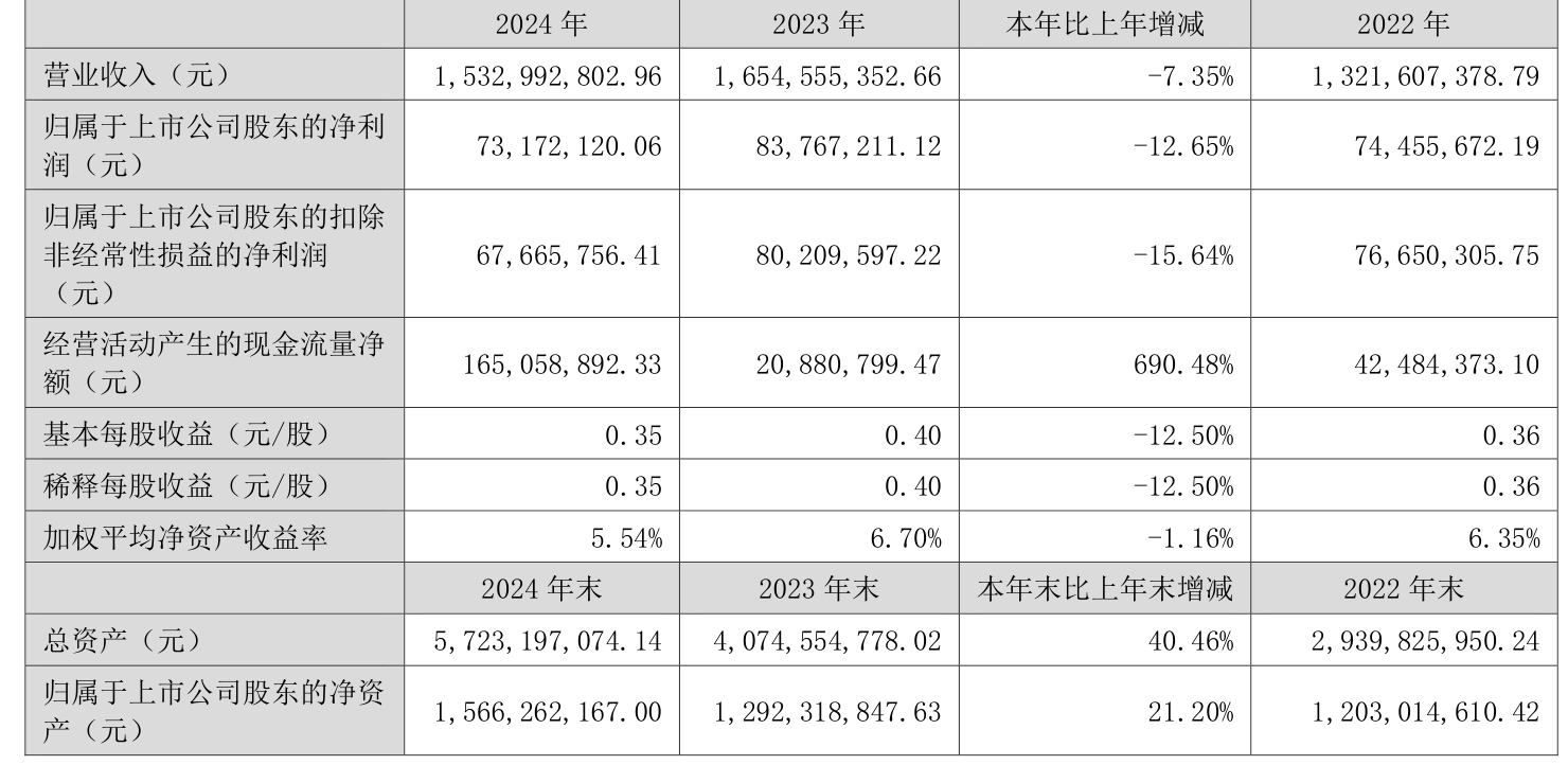 中证智能财讯和远气体(002971)4月25日披露2024年年度报告。2024年,公司实现营业总收入15.33亿元,同比下降7.35%;归母净利润7317.21万元,同比下降12.65%;扣非净利润6766.58万元,同比下降15.64%;经营活动产生的现金流量净额为1.65亿元,同比增长690.48%;报告期内,和远气体基本每股收益为0.35元,加权平均净资产收益率为5.54%。公司2024年度分配预案为:拟向全体股东每10股派现1元(含税)。