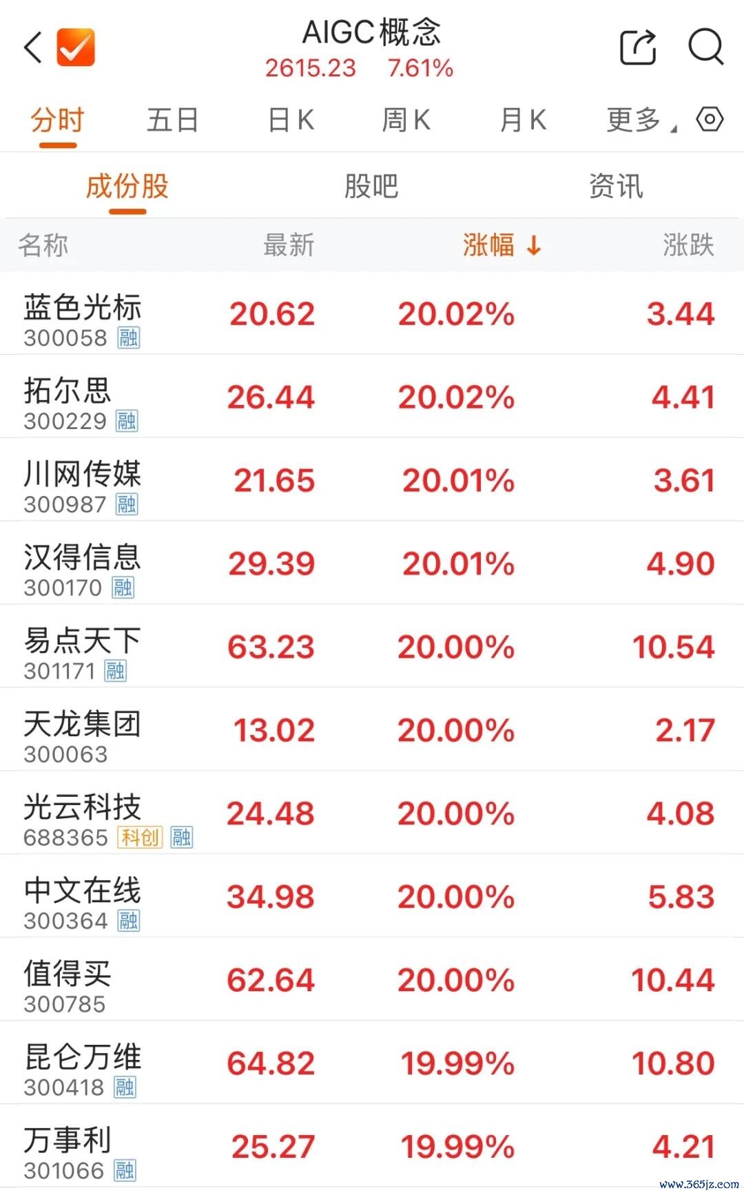 早盘,AI应用方向集体大涨,Kimi概念、Sora概念涨幅居前。截至午间收盘,易点天下、中文在线、值得买、蓝色光标、拓尔思、昆仑万维等多股以20%幅度涨停,万兴科技、因赛集团涨超10%。此外,引力传媒开盘“一字涨停”,走出6天5板。