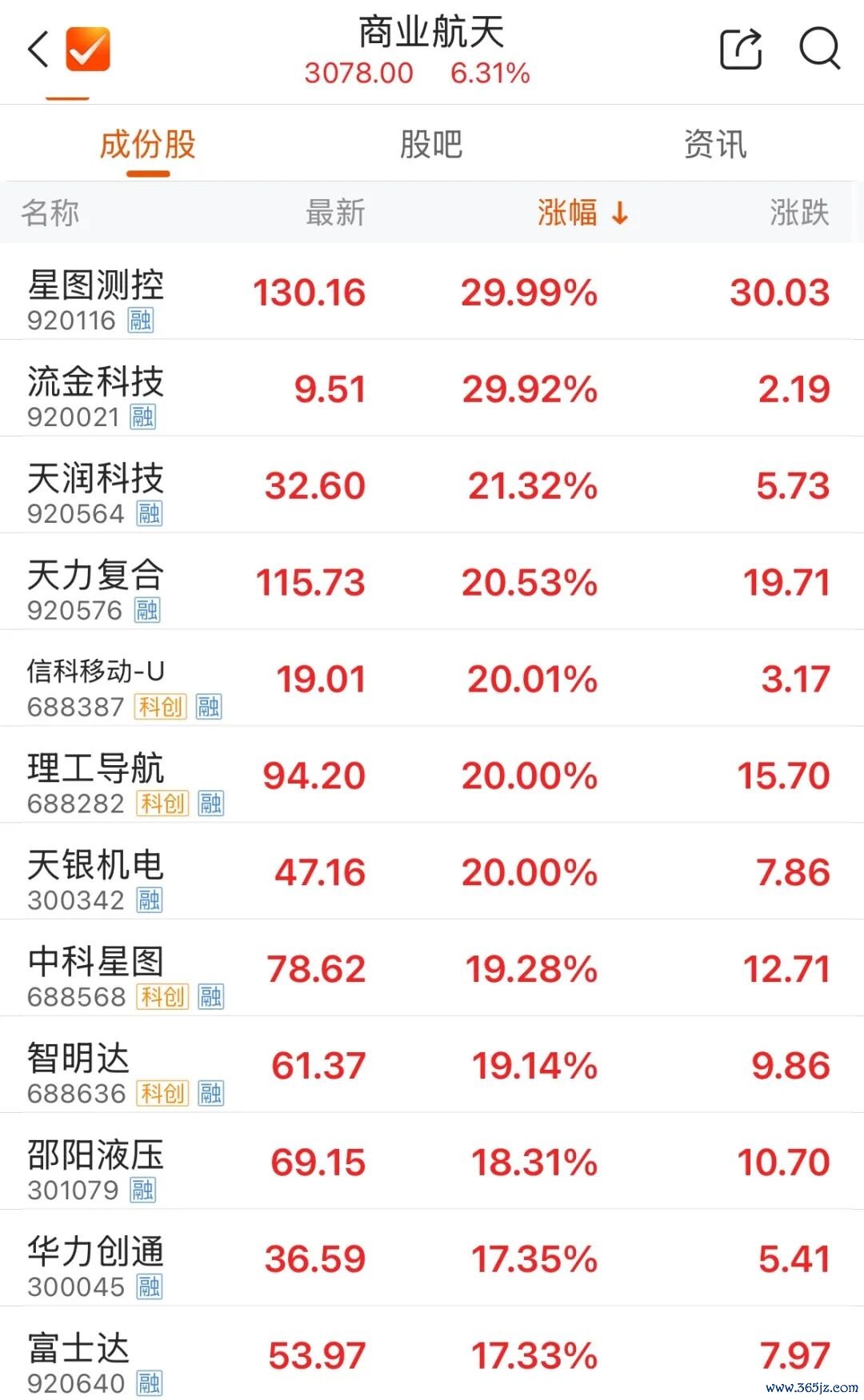 早盘,商业航天板块延续强势。截至收盘,星图测控以30%幅度涨停,理工导航、天银机电以20%幅度涨停,金风科技5连板,通宇通讯4天3板,巨力索具、杭萧钢构、航天电子3连板。