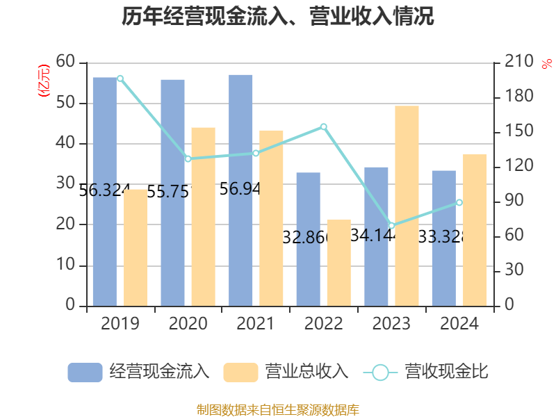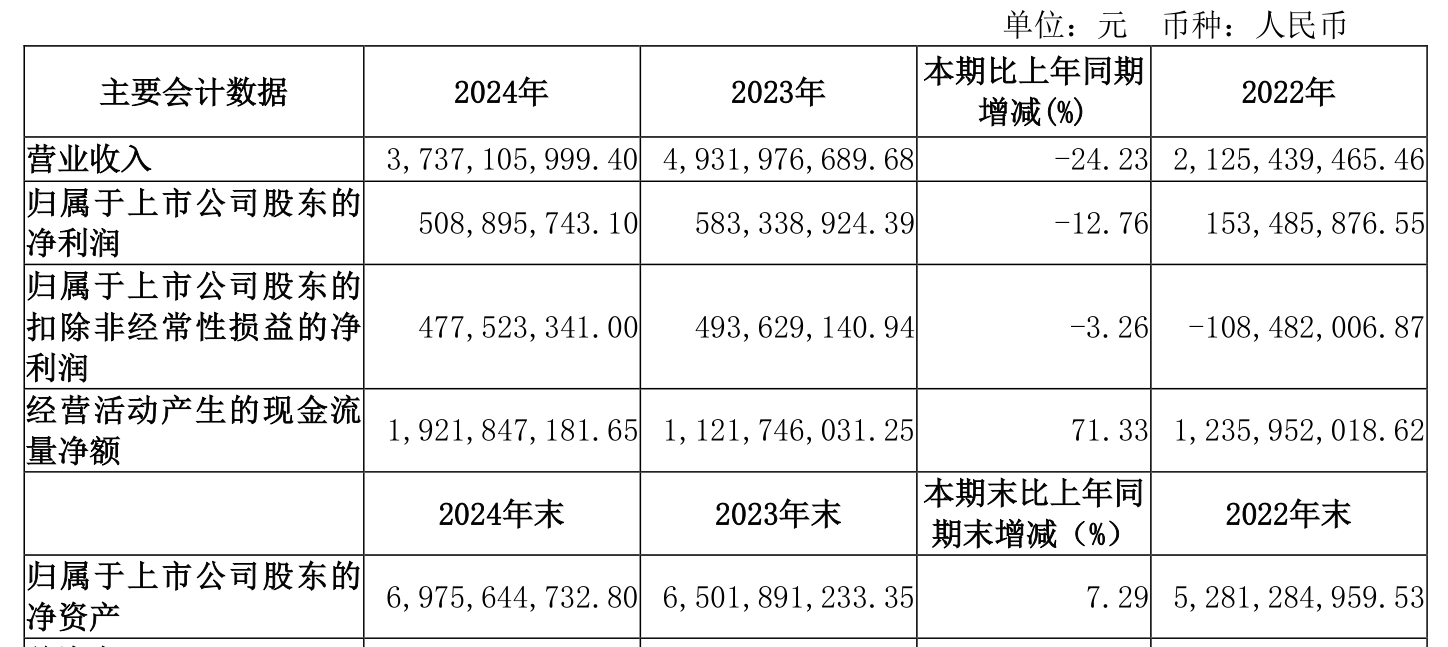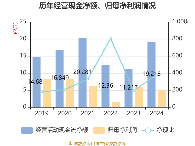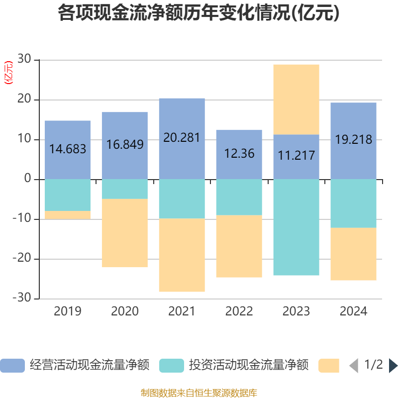 截至2024年,公司经营活动现金流净额为19.22亿元,同比增长71.33%;筹资活动现金流净额-13.2亿元,同比减少30.76亿元;投资活动现金流净额-12.23亿元,上年同期为-24.19亿元。
