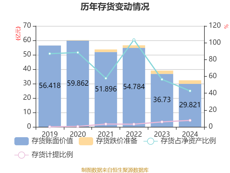 从存货变动来看,截至2024年末,公司存货账面价值为29.82亿元,占净资产的42.75%,较上年末减少6.91亿元。其中,存货跌价准备为2.49亿元,计提比例为7.72%。