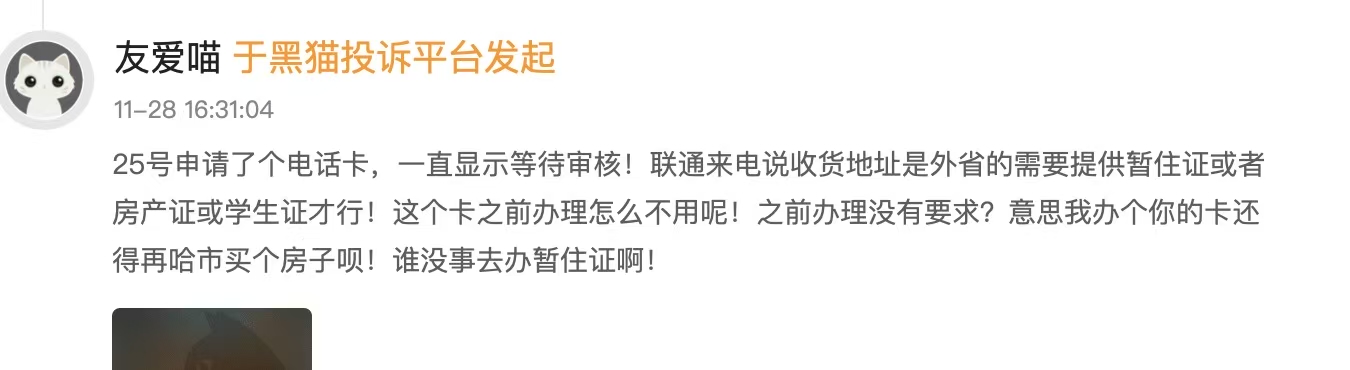 有网友于2024年11月投诉中国联通称,其申请电话卡后,联通来电说收货地址是外省的需要提供暂住证或者房产证或学生证才行。“这个卡之前办理怎么没有这些要求呢?我办个卡还得再买个房子呗,谁没事去办暂住证啊。”该网友吐槽道。