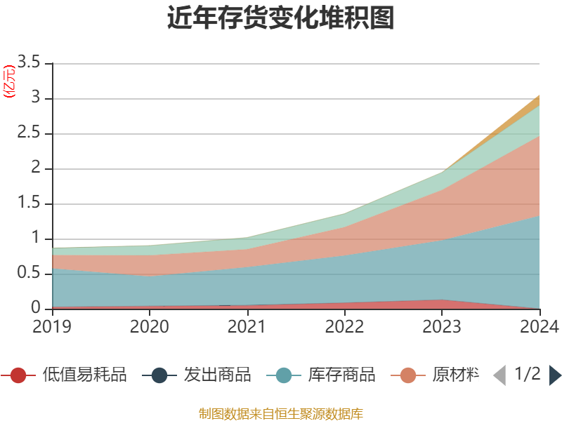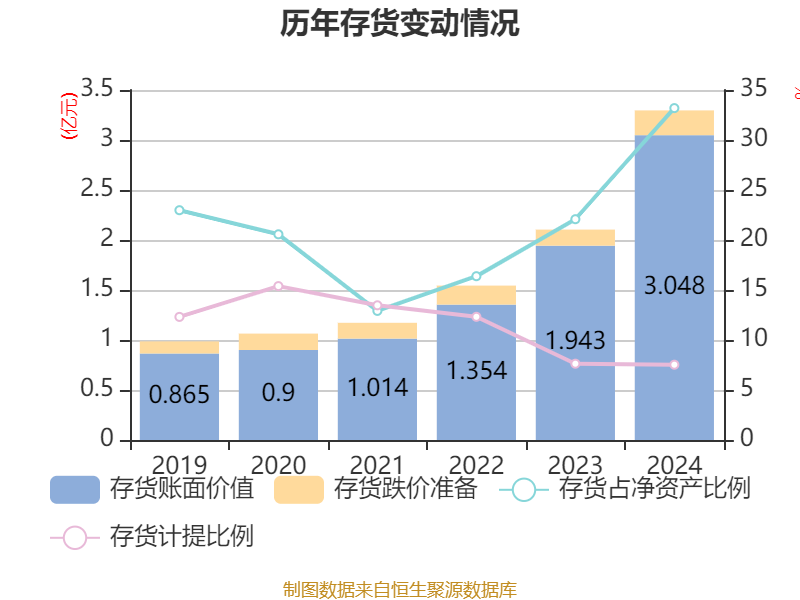 从存货变动来看,截至2024年末,公司存货账面价值为3.05亿元,占净资产的33.19%,较上年末增加1.1亿元。其中,存货跌价准备为2482.62万元,计提比例为7.53%。