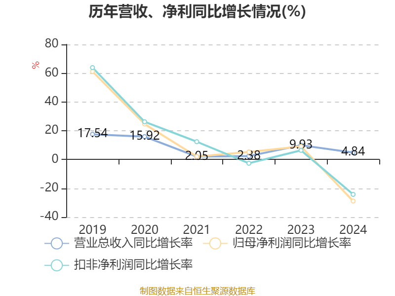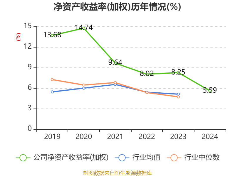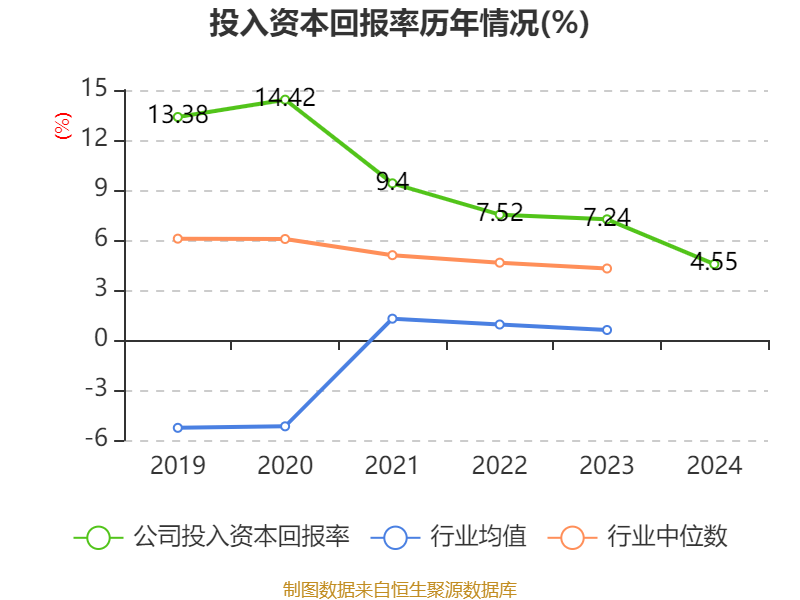 数据显示,2024年公司加权平均净资产收益率为5.59%,较上年同期下降2.66个百分点。公司2024年投入资本回报率为4.55%,较上年同期下降2.69个百分点。