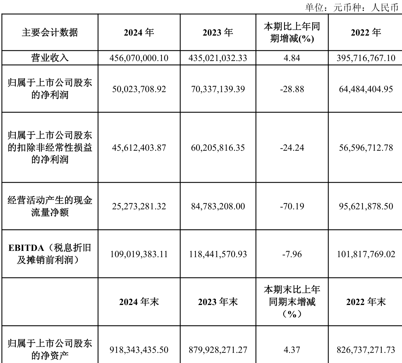中证智能财讯圣诺生物(688117)4月25日披露2024年年度报告。2024年,公司实现营业总收入4.56亿元,同比增长4.84%;归母净利润5002.37万元,同比下降28.88%;扣非净利润4561.24万元,同比下降24.24%;经营活动产生的现金流量净额为2527.33万元,同比下降70.19%;报告期内,圣诺生物基本每股收益为0.45元,加权平均净资产收益率为5.59%。公司2024年度分配预案为:拟向全体股东每10股转4股,派现1.4元(含税)。