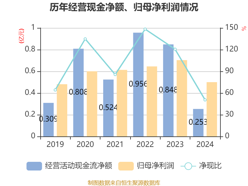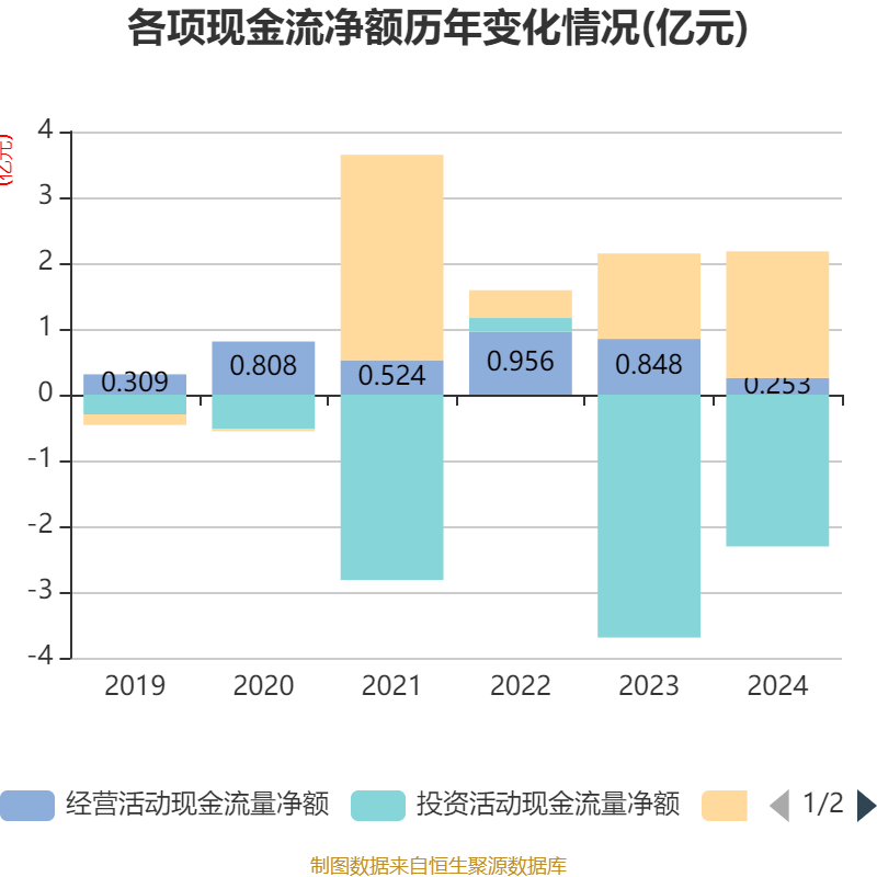 截至2024年,公司经营活动现金流净额为2527.33万元,同比下降70.19%;筹资活动现金流净额1.93亿元,同比增加6275.56万元;投资活动现金流净额-2.31亿元,上年同期为-3.69亿元。