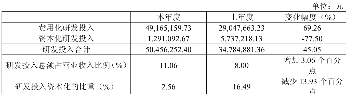 2024年全年,公司研发投入金额为5045.63万元,同比增长45.05%;研发投入占营业收入比例为11.06%,相比上年同期上升3.06个百分点。此外,公司全年研发投入资本化率为2.56%。